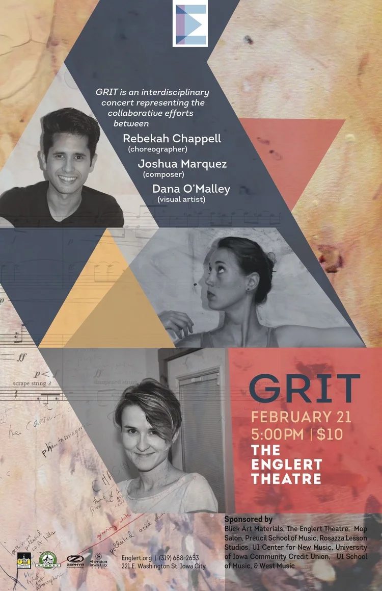 GRIT is an interdisciplinary performance representing the collaborative efforts between Rebekah Chappell (choreographer), Joshua Marquez (composer), and Dana O'Malley (visual artist) culminating in a performance at The Englert Theatre on February 21, 2016. This 70-minute collaborative concert weaves dance, music, and visual art into one, seamless production on the Englert stage. GRIT is about the perseverance (grit) needed to overcome the obstacles (grit) that we confront in our daily lives and the dialogue needed to grow from them.